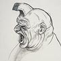 Einzelblätter, das klingt wie versprengte Truppenteile, die sich nach einer Schlacht wieder formieren und so ist es auch bei mir. Die Handzeichnung ist eine besondere Herausforderung in ihrer Unmittelbarkeit. Selten nimmt sie mehr als 2 Stunden in Anspruch. Und selbst hier kann man sehen, so richtige Solitaire findet man nicht. Ein Blatt ist eine Vorarbeit zur Skulptur »Charon«. Die Hommage á FXM ist auch eine Vorarbeit zum darauffolgenden Eisenkopf. Und so ist es einfach: Der Prozess des künstlerischen Denkens beginnt mit der Handzeichnung. Sie ist die Ursuppe, aus der die großen Werke geboren werden. Einfach in der Handhabung, ist es das reine Denken auf Papier. Der Ursprung sämtlicher weitertragender Ideen. Insofern ist die Handzeichnung immer eingebettet in das allgemeine Gedankengebäude und die hier vorgestellte Kollektion könnte genauso gut seinen Projekten zugeordnet werden.